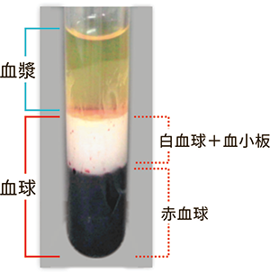 まず、血液は大きく分けて血液中の細胞である「血球成分」と液体である「血漿(けっしょう)成分」に分かれます。