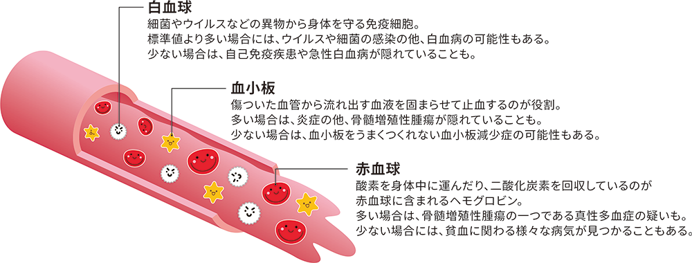 健康診断の結果表に並ぶ数字の中でも、「赤血球」「白血球」「血小板」といった項目は、多くの方が目にするものだと思います。