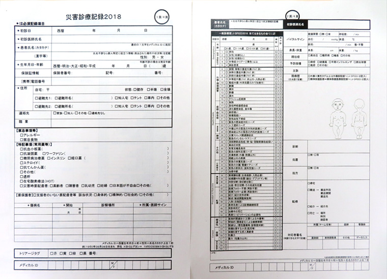 この様式は、東日本大震災の教訓をもとに日本医師会や日本災害医学会などで構成される「災害時の診療録のあり方に関する合同委員会」によって作成されたものです。統一された様式を使用することで、災害時にすべての医療チームが共通の記録を用いることができ、チーム間や地域医療への情報引継ぎが効率化され、継続的な医療提供につながります。